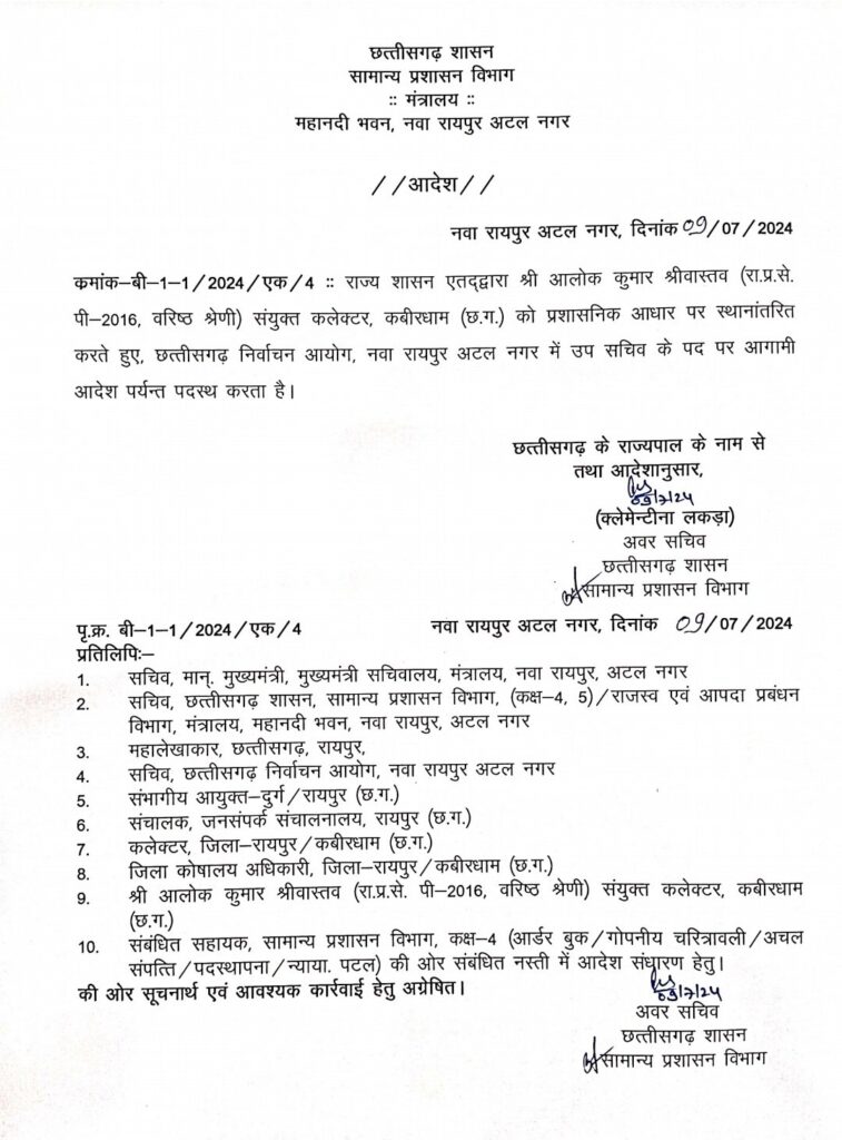 रायपुर। CG Breaking : राज्य सरकार ने कबीरधाम के संयुक्त कलेक्टर आलोक कुमार श्रीवास्तव का ट्रांसफर छत्तीसगढ़ निर्वाचन आयोग में उप सचिव के पद पर कर दिया है।