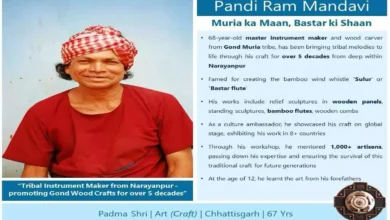 CG NEWS:-छत्तीसगढ़ के नारायणपुर जिले के गोंड मुरिया जनजाति के प्रसिद्ध कलाकार पंडी राम मंडावी को पारंपरिक वाद्ययंत्र निर्माण और…